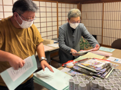 報恩講資料の袋詰め、本堂椅子の設置、なんといっても五色幕とむらさき幕の設置が大変でした。また、報恩講の夕べのリハが行われました。