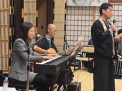 法要後の報恩講の夕べでは、「阿弥陀さんといっしょにコンサート」と題し、京都より圓重寺(えんじゅうじ)のご門徒でジャズシンガーの中村由香(なかむらゆか)さんと長徳寺(ちょうとくじ)ご住職の仁科洸(にしなこう)さんに数々の歌をご披露いただきました。当山住職もマイクを持ち、満堂の参加者も懐かしい歌をともに歌い、阿弥陀さんの願いに包まれながらほのぼのとした思いで楽しい時を過ごしたことでございます。