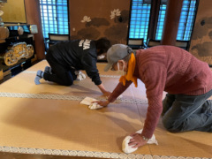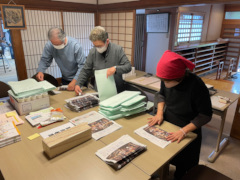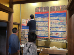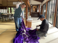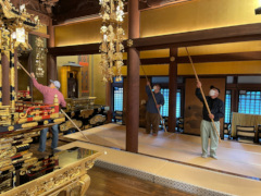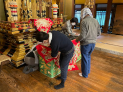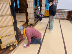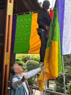報恩講資料の袋詰め、本堂椅子の設置、なんといっても五色幕とむらさき幕の設置が大変でした。また、報恩講の夕べのリハが行われました。