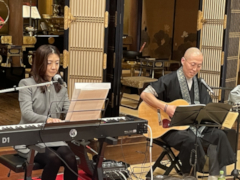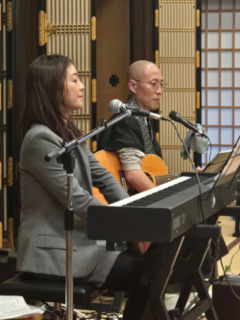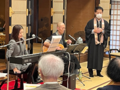 続いて「報恩講の夕べ」では、住職が1年間京都教区山城2組の真宗入門講座(京都常盤会館5回・東本願寺同朋会館2泊3日)で講師を勤めたときの受講者の圓重寺のご門徒でジャズシンガーの中村由香さんと、講座のスタッフであった超徳寺ご住職の仁科洸さんに「阿弥陀さんといっしょにコンサート」と題して、念仏を通して、蓮光寺門徒に出遇えた喜びの中、「真宗宗歌」ほかおなじみの歌の数々を、会話を交えて、歌っていただきました。蓮光寺住職も何曲か歌いました。