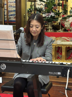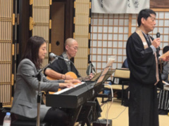 法要後の報恩講の夕べでは、「阿弥陀さんといっしょにコンサート」と題し、京都より圓重寺(えんじゅうじ)のご門徒でジャズシンガーの中村由香(なかむらゆか)さんと長徳寺(ちょうとくじ)ご住職の仁科洸(にしなこう)さんに数々の歌をご披露いただきました。当山住職もマイクを持ち、満堂の参加者も懐かしい歌をともに歌い、阿弥陀さんの願いに包まれながらほのぼのとした思いで楽しい時を過ごしたことでございます。